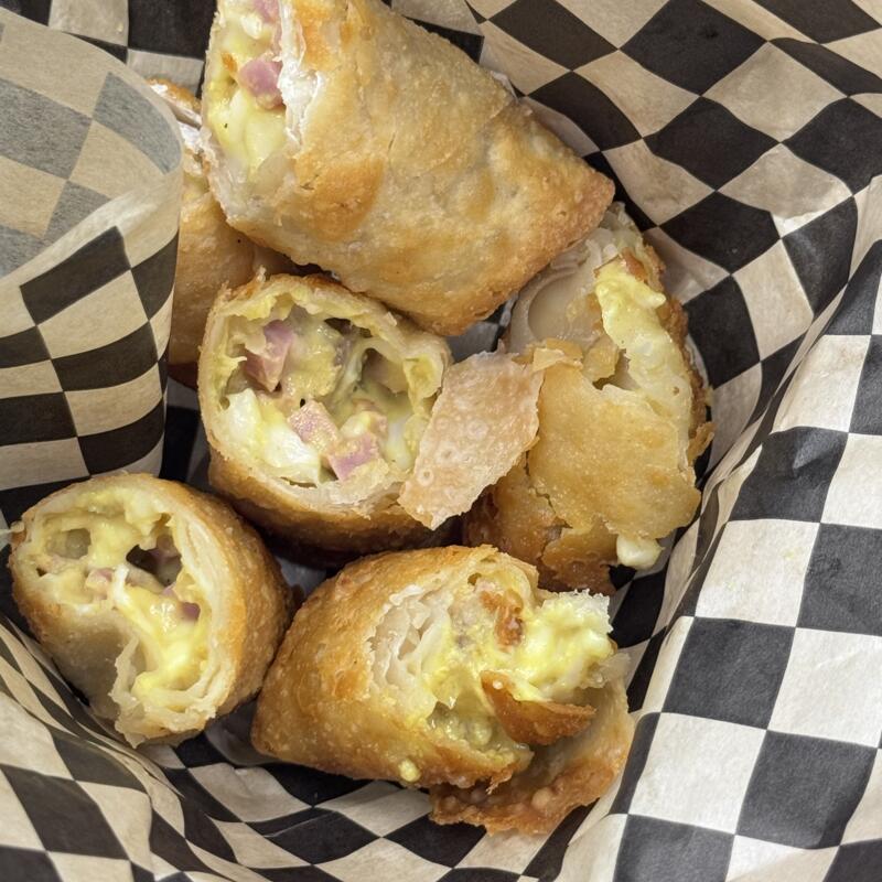 Craveable spin on a classic sandwich in a crispy egg roll slow slow-roasted pork, savory ham, melted cheese, dill pickle & mustard. pairs well with our tangy Utah BBQ sauce.
